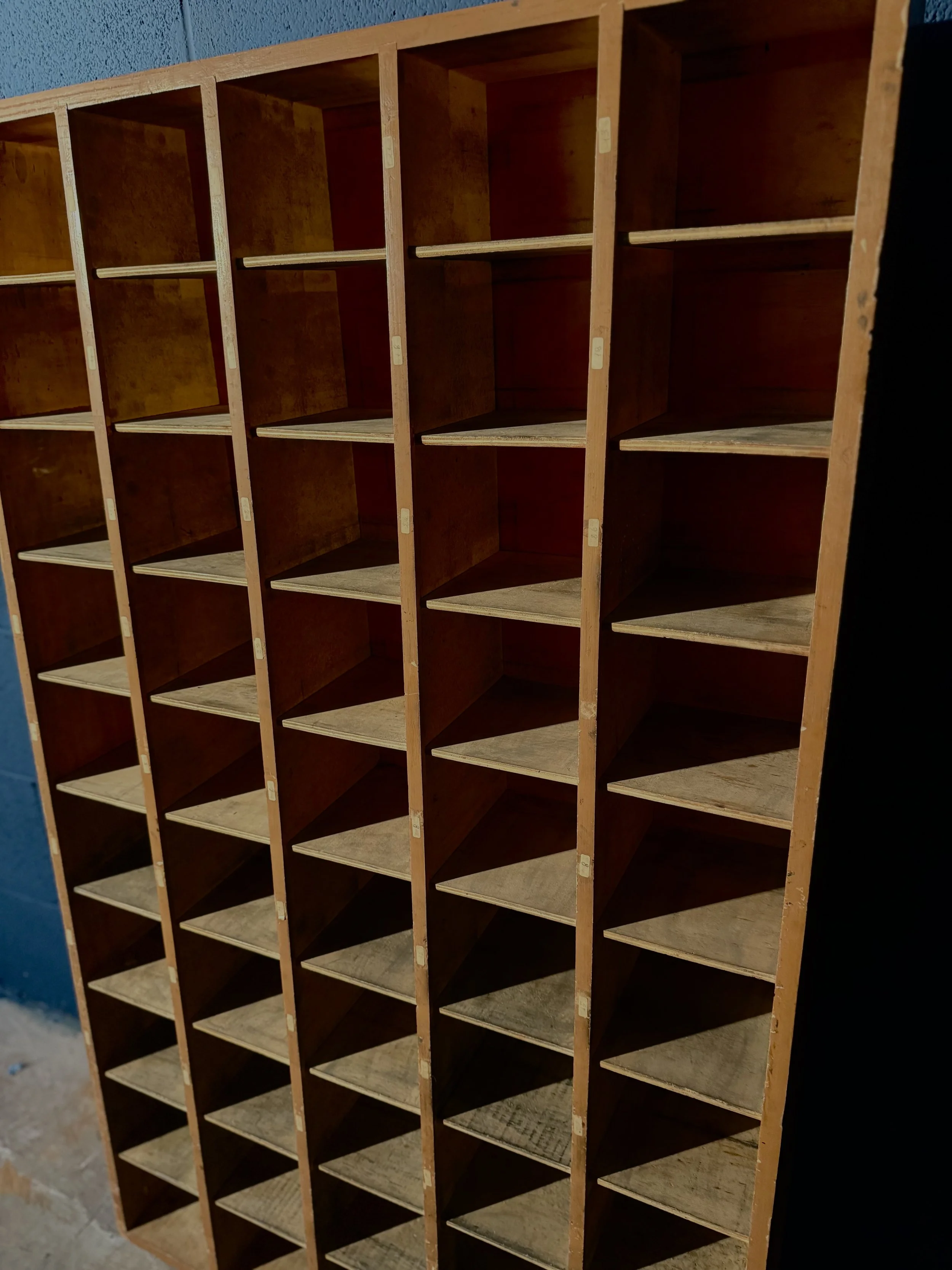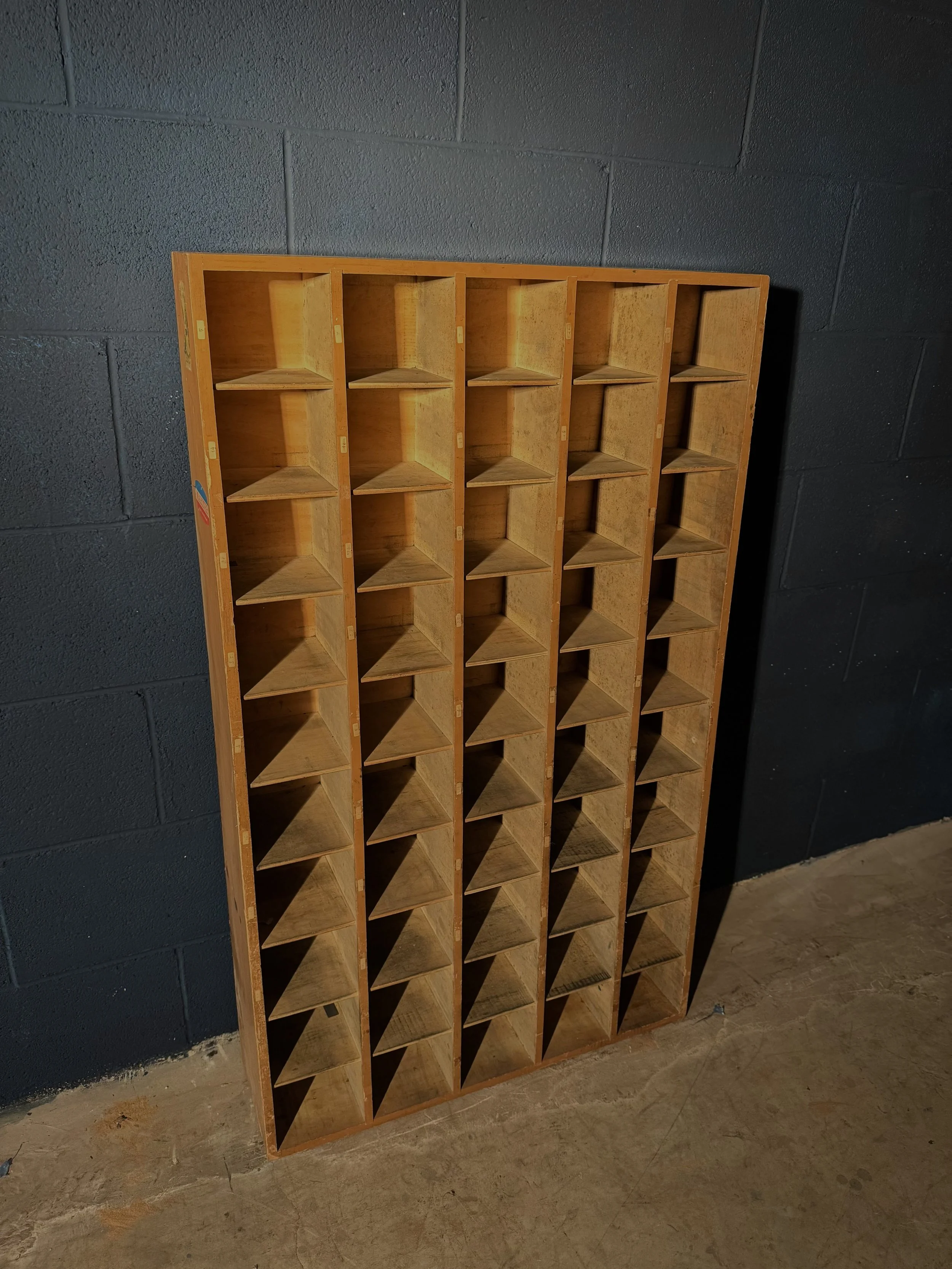 Un autentico pezzo di storia industriale, questo schedario vintage in legno risale molto probabilmente agli anni ’50. Composto da 50 scomparti inclinati, conserva il fascino autentico dell’arredo funzionale del dopoguerra, con una struttura solida e patina del tempo che ne valorizza l’anima vissuta.