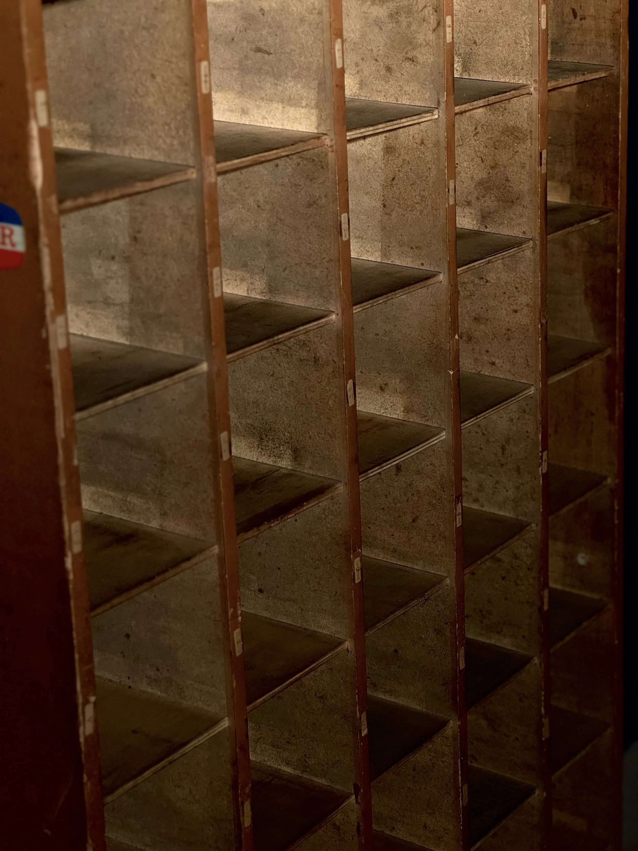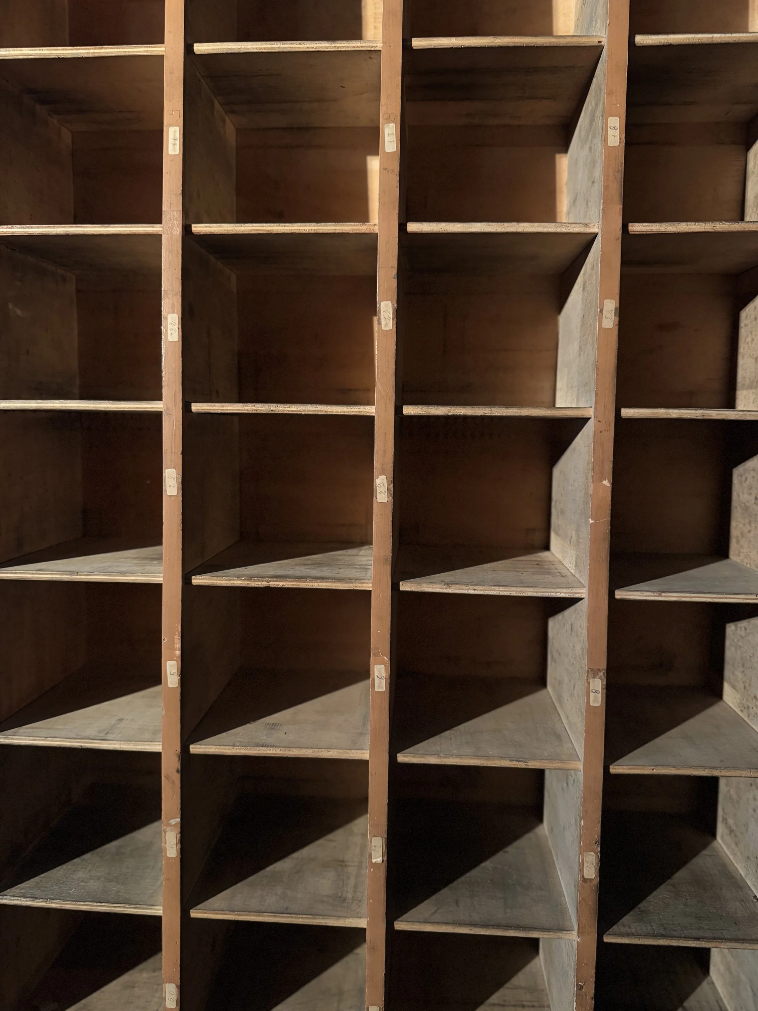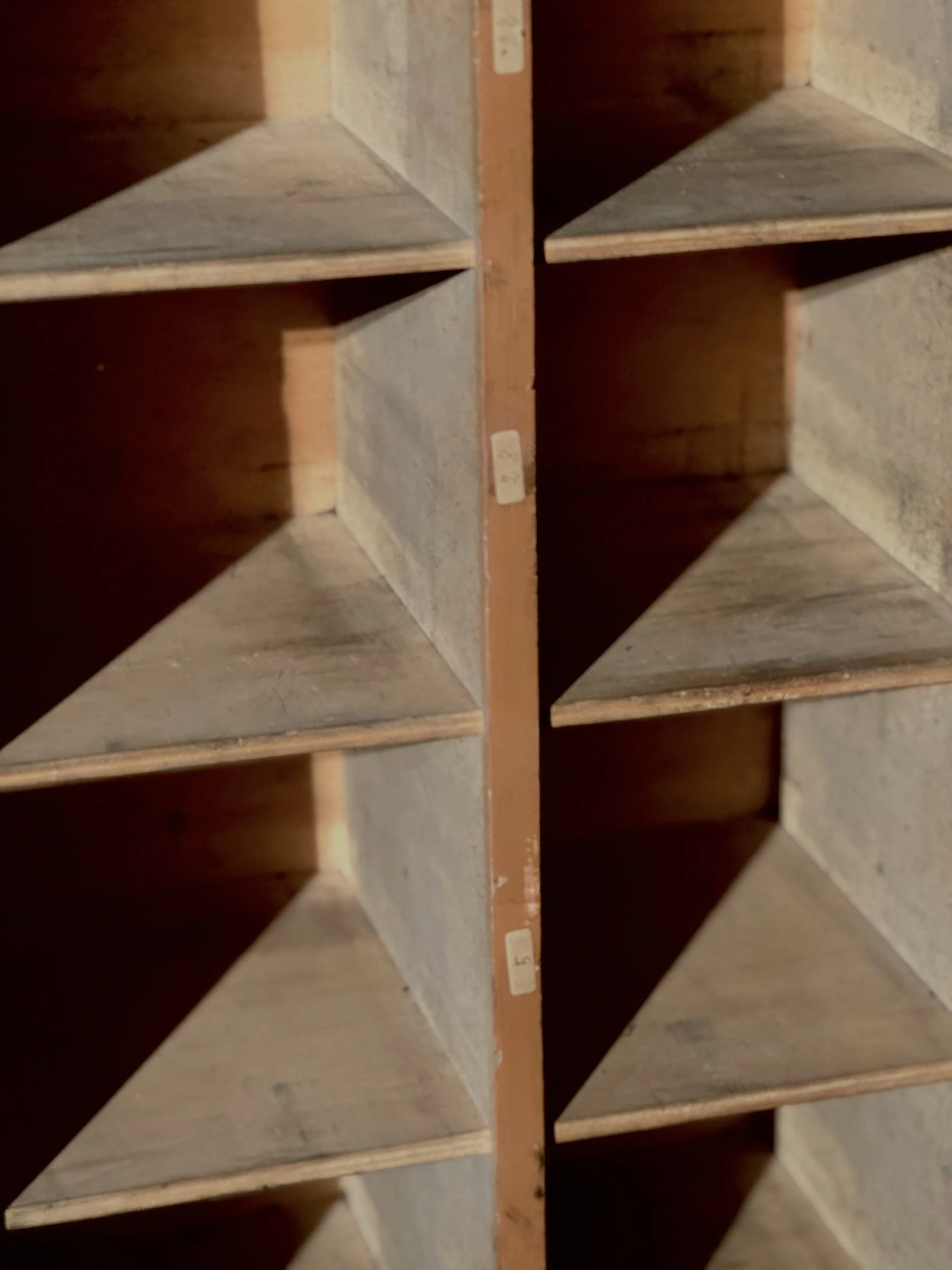 Realizzato interamente in legno, presenta dettagli artigianali come le etichette numerate originali ancora presenti su alcuni vani. Questo mobile richiama lo spirito razionalista del design funzionale di Jean Prouvé o il rigore geometrico delle produzioni di Marcel Breuer, con un tocco caldo e naturale dato dalla matericità del legno.
