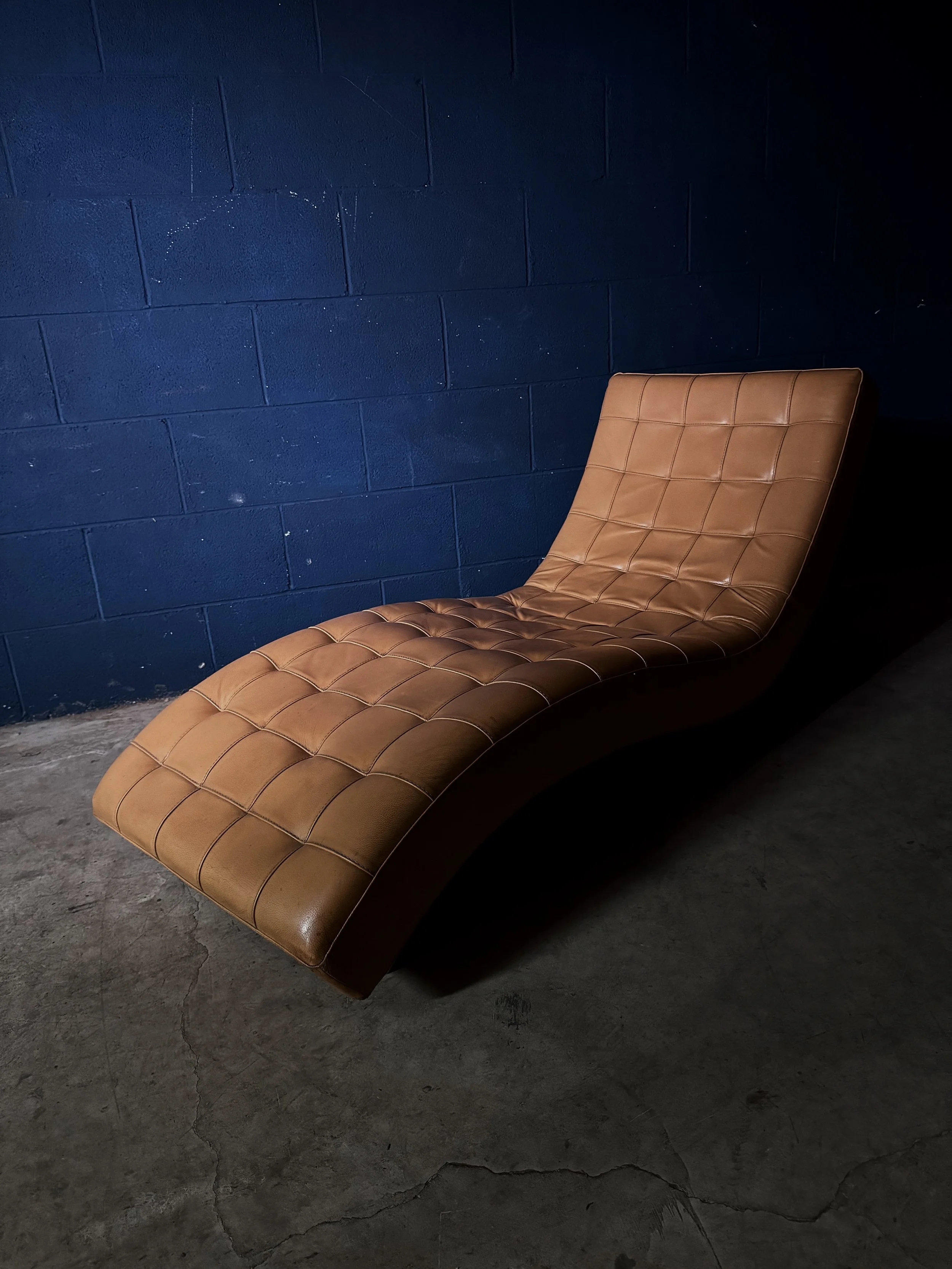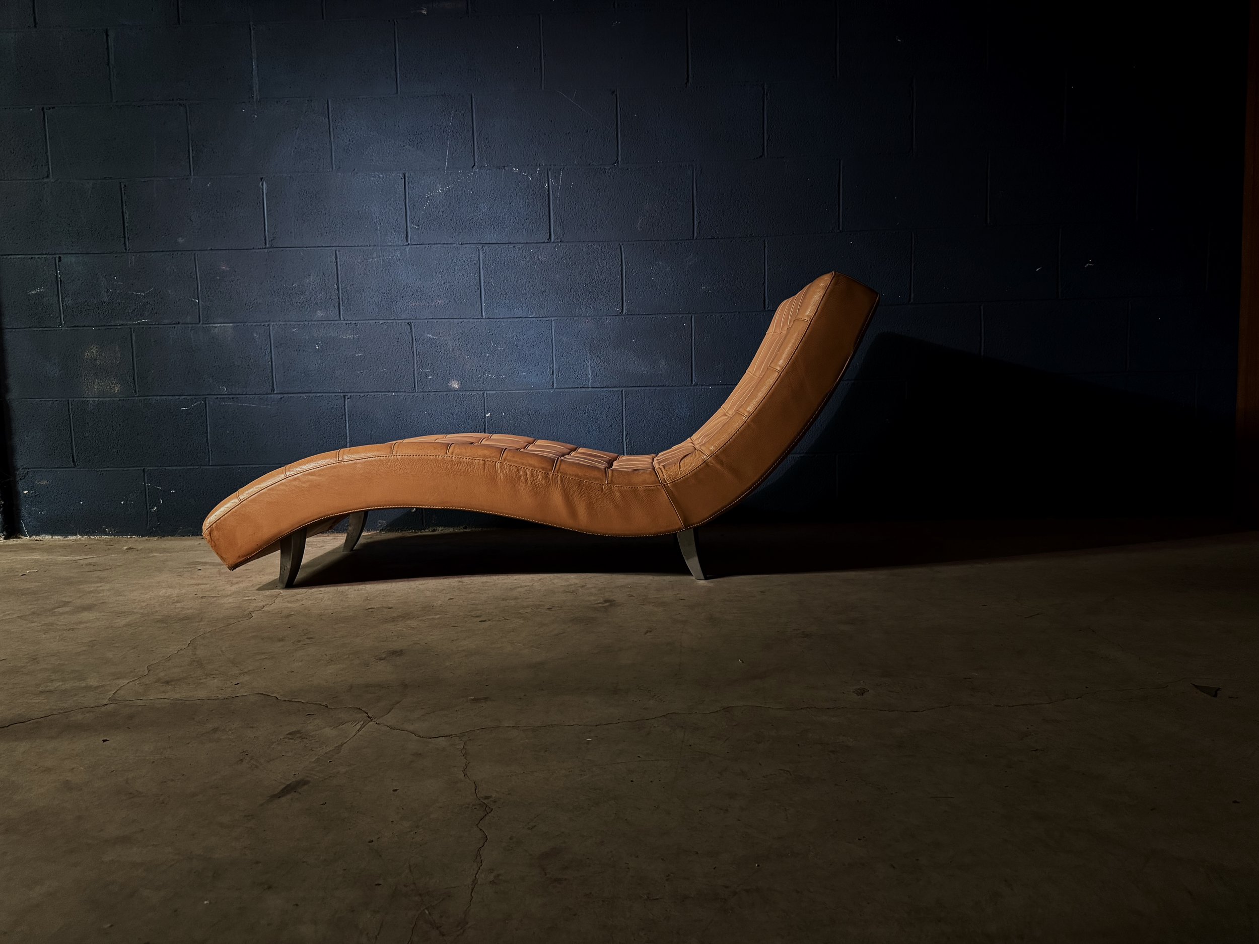La seduta è rivestita in morbida pelle color cognac, elegantemente trapuntata, che invecchia con fascino e carattere.