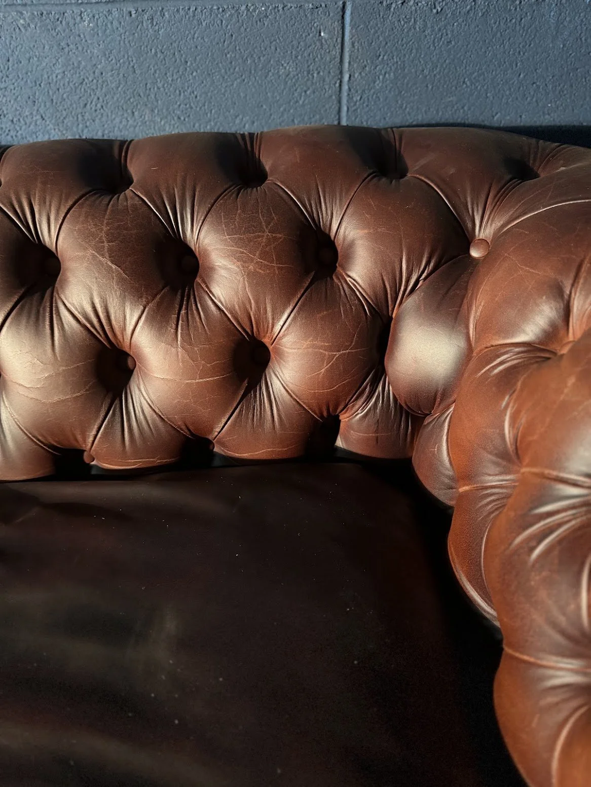 Un autentico capolavoro del design inglese: questo divano Chesterfield vintage è l'essenza dell'eleganza e del comfort. Realizzato in vera pelle con una calda tonalità marrone, presenta la celebre lavorazione capitonné su schienale e braccioli, simbolo indiscusso di artigianalità e prestigio.