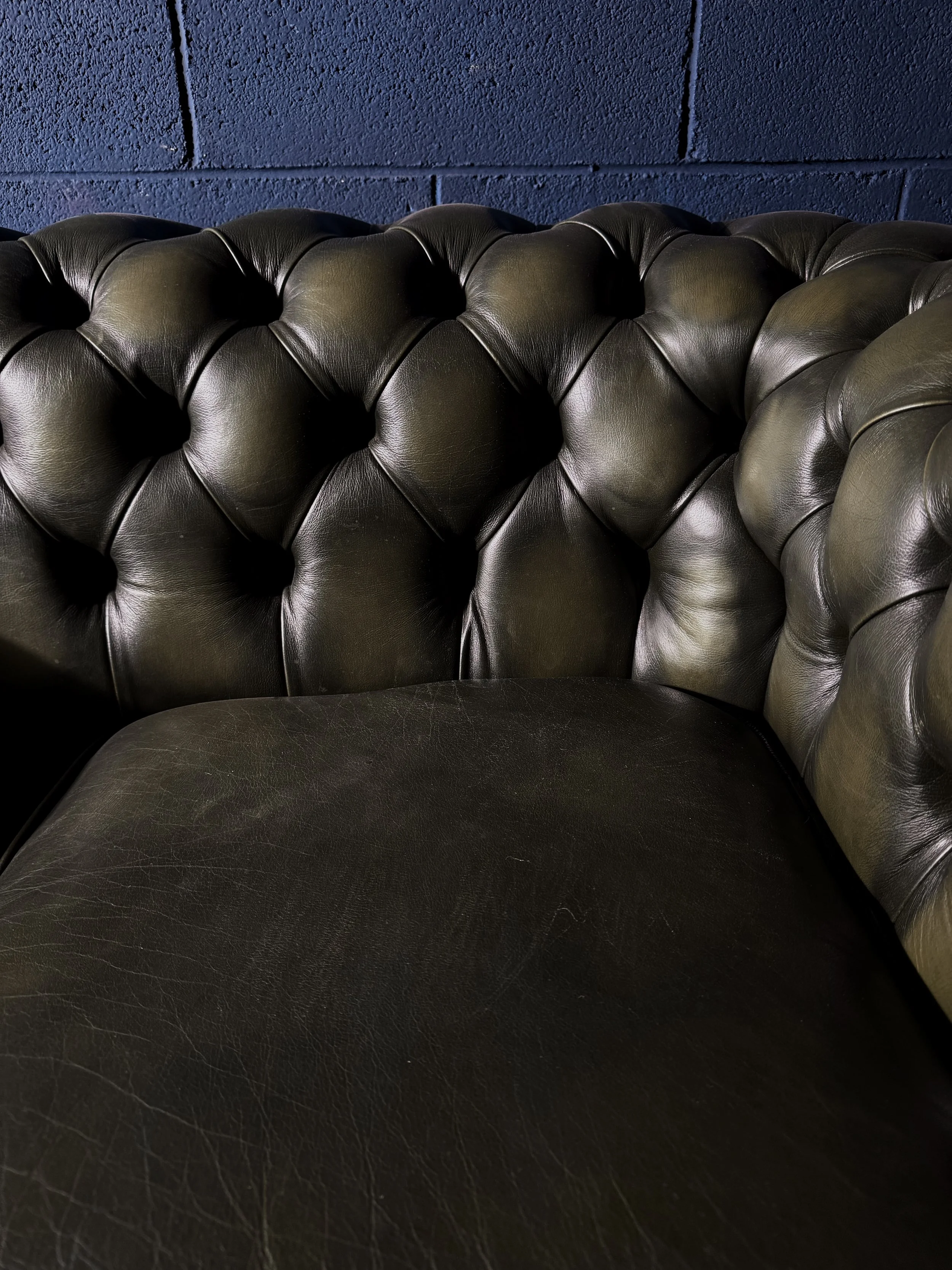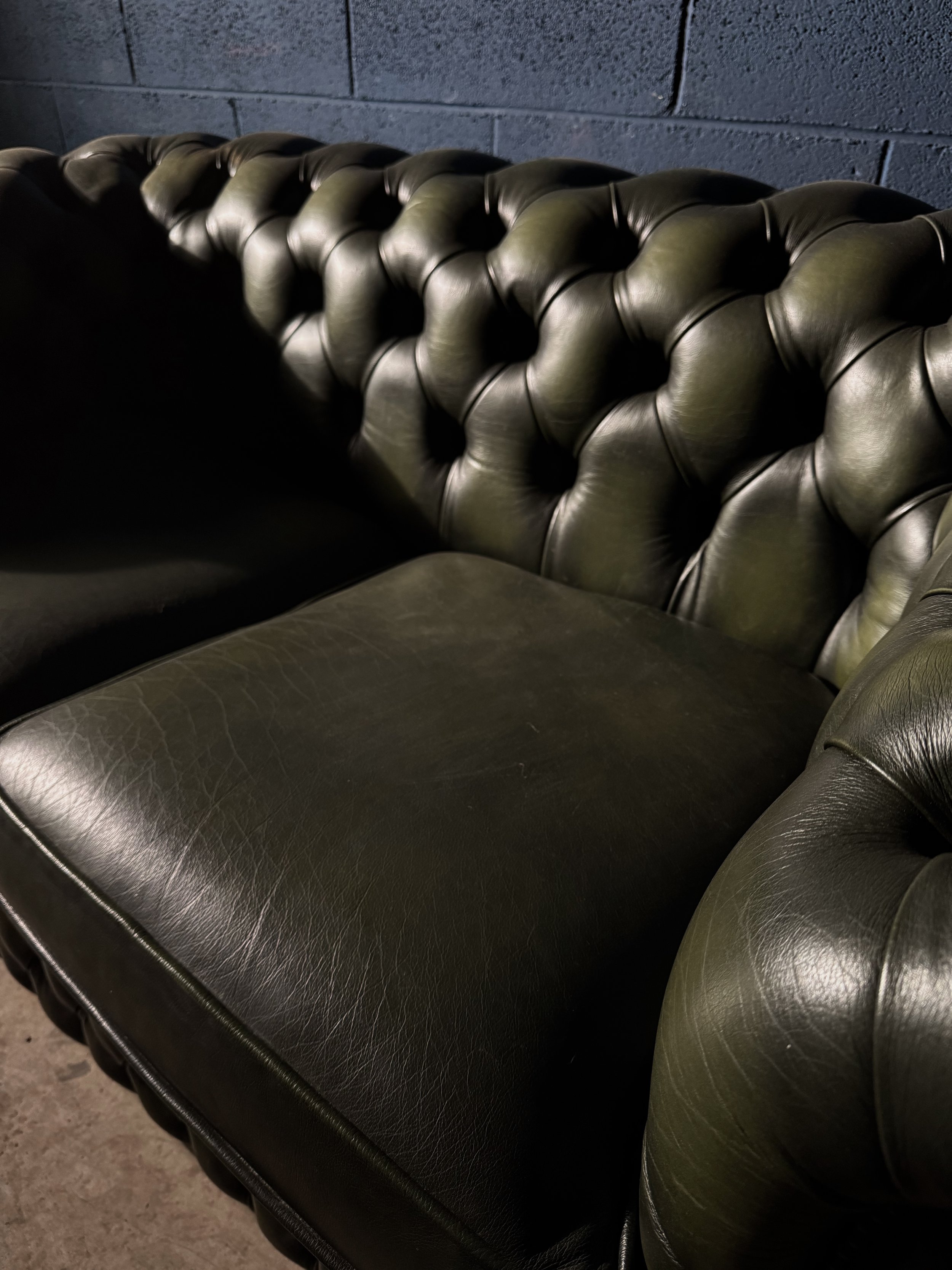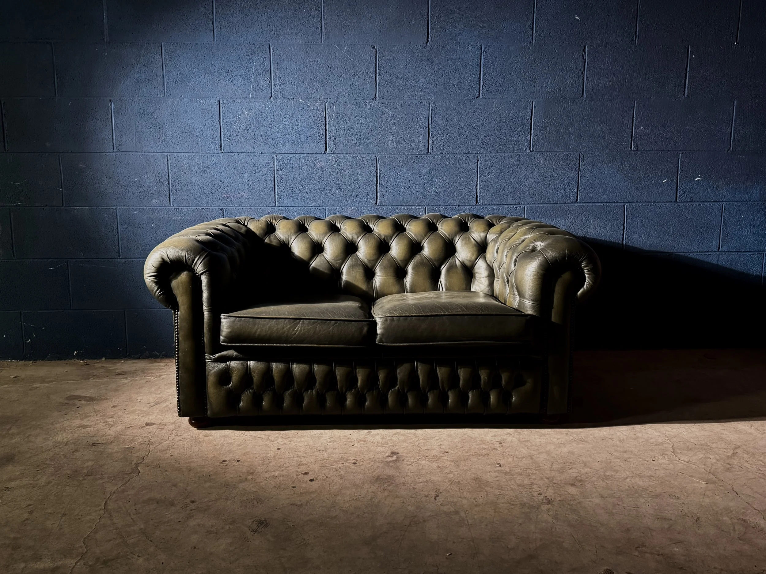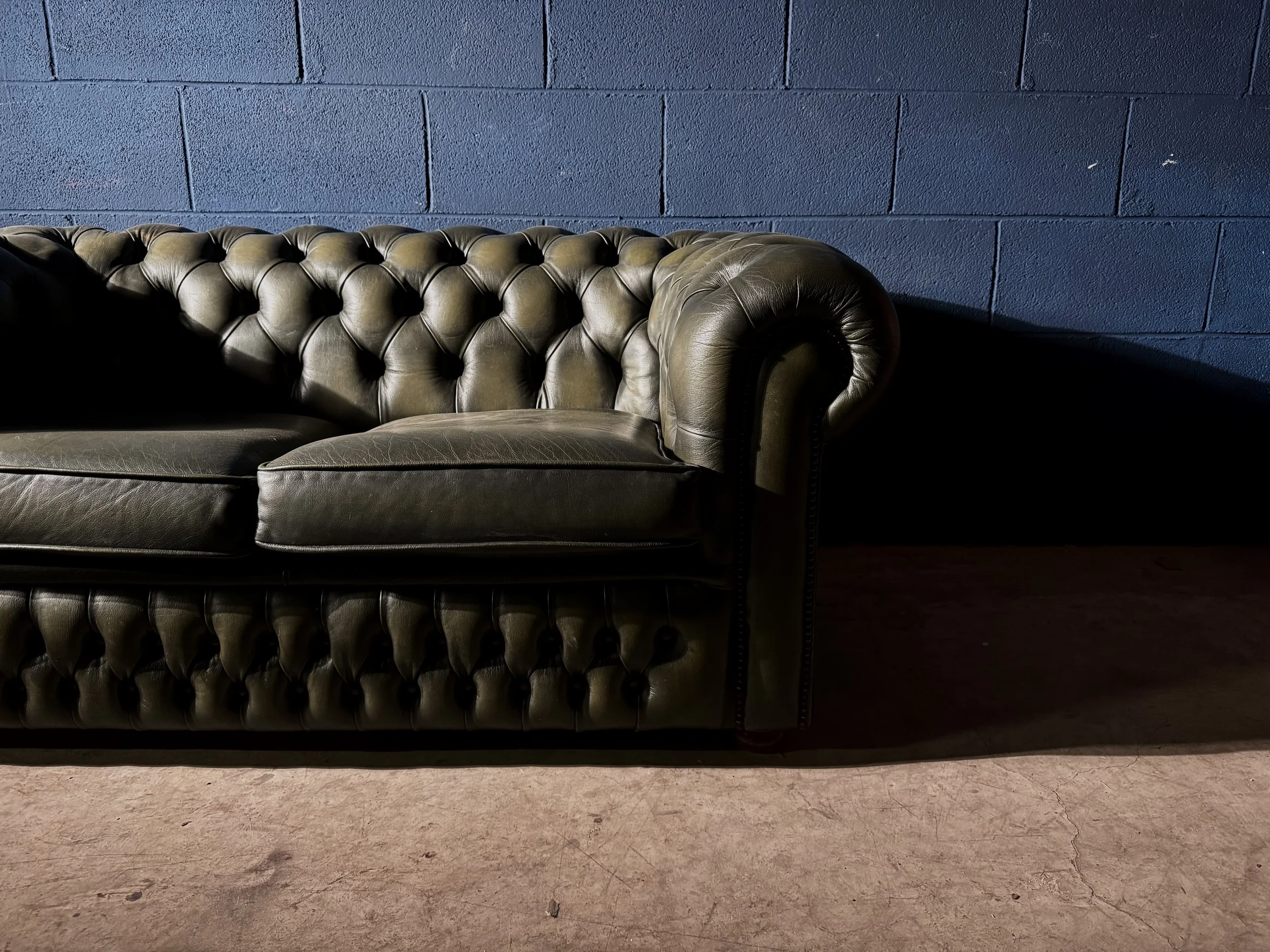Questo è un autentico divano Chesterfield vintage, un’icona di eleganza senza tempo.