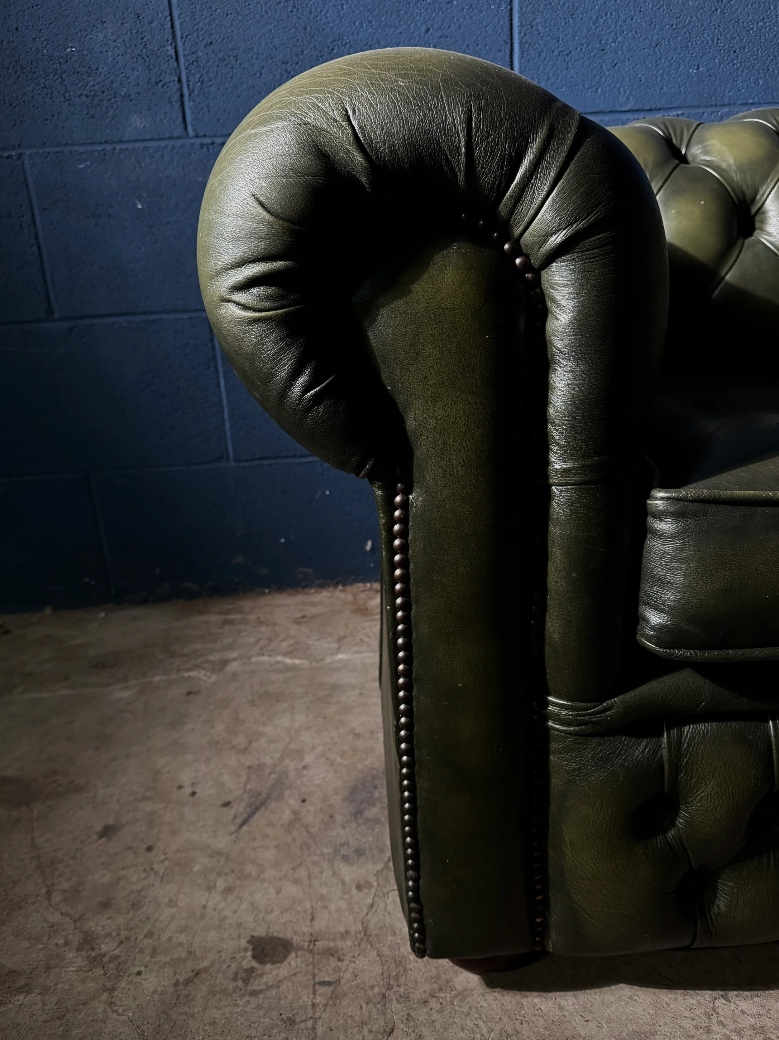 La sua struttura solida in legno accoglie una ricca imbottitura rivestita in vera pelle verde inglese, dall’inconfondibile lavorazione capitonné.