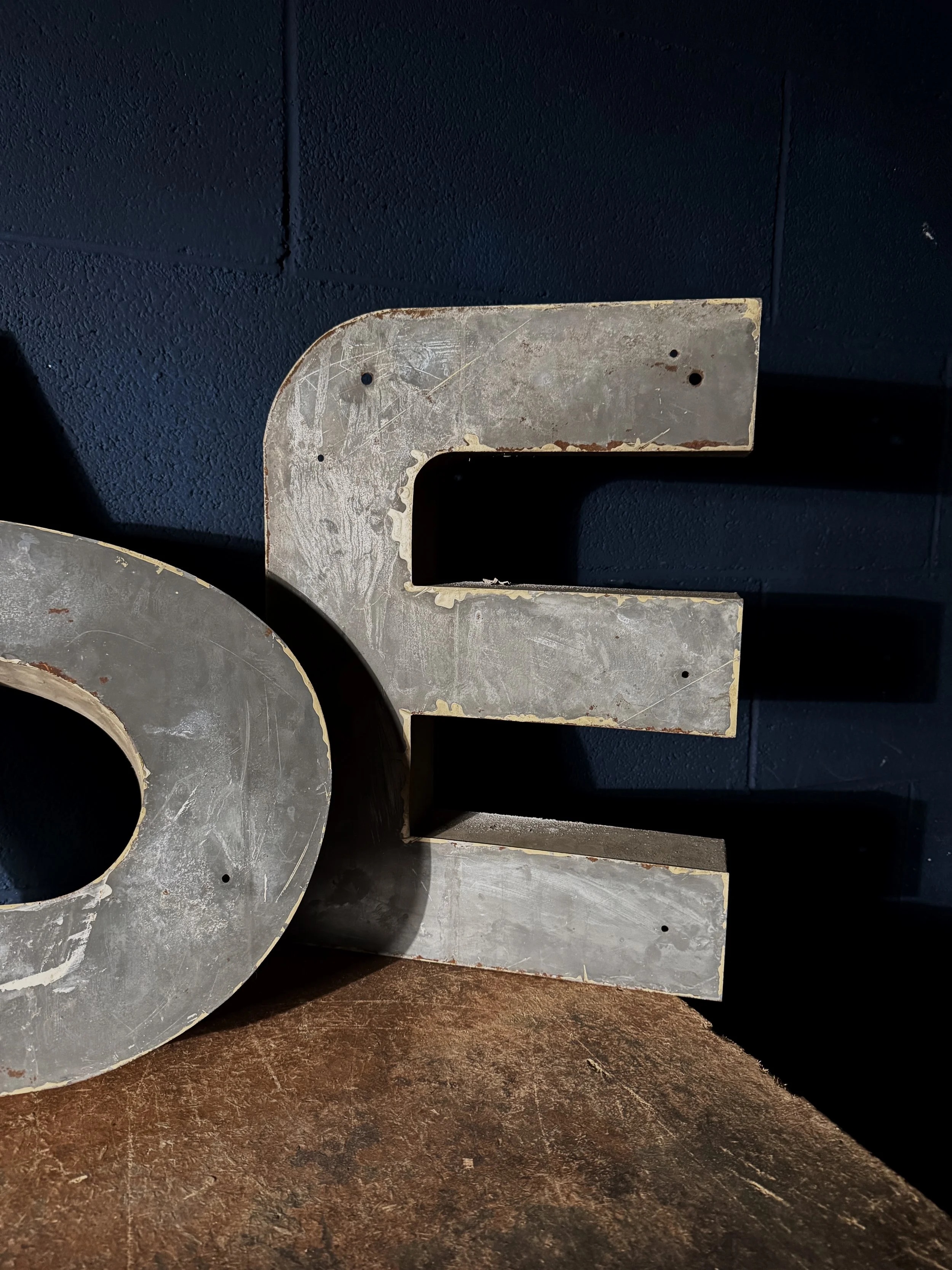 Coppia di lettere decorative in metallo, provenienti da un’insegna pubblicitaria originale.